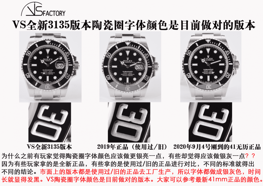 大家可以參考最新買到的 41mm 正品的顏色。 大家可以看不用多久,有些市面版本的陶瓷圈塗層顏色就會開始跟著 VS 把塗層顏色升級成 VS 這種銀亮色。