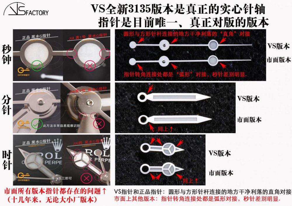 VS 是真正的實心針軸(可以看上圖秒針的 VS 版本) 其實比起市場版本所炒作的實心針軸這個細節(需放大才看的清楚),其實指標的外觀差別更加明顯,這是大家不用任何放大,直接用肉眼就可以看出真假的鑒別點。