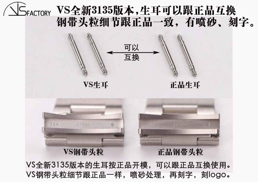 6.VS 版本的生耳按正品開模,可以跟正品互換使用。 鋼帶頭粒細節跟正品一樣,噴砂處理,有刻字,刻 logo。