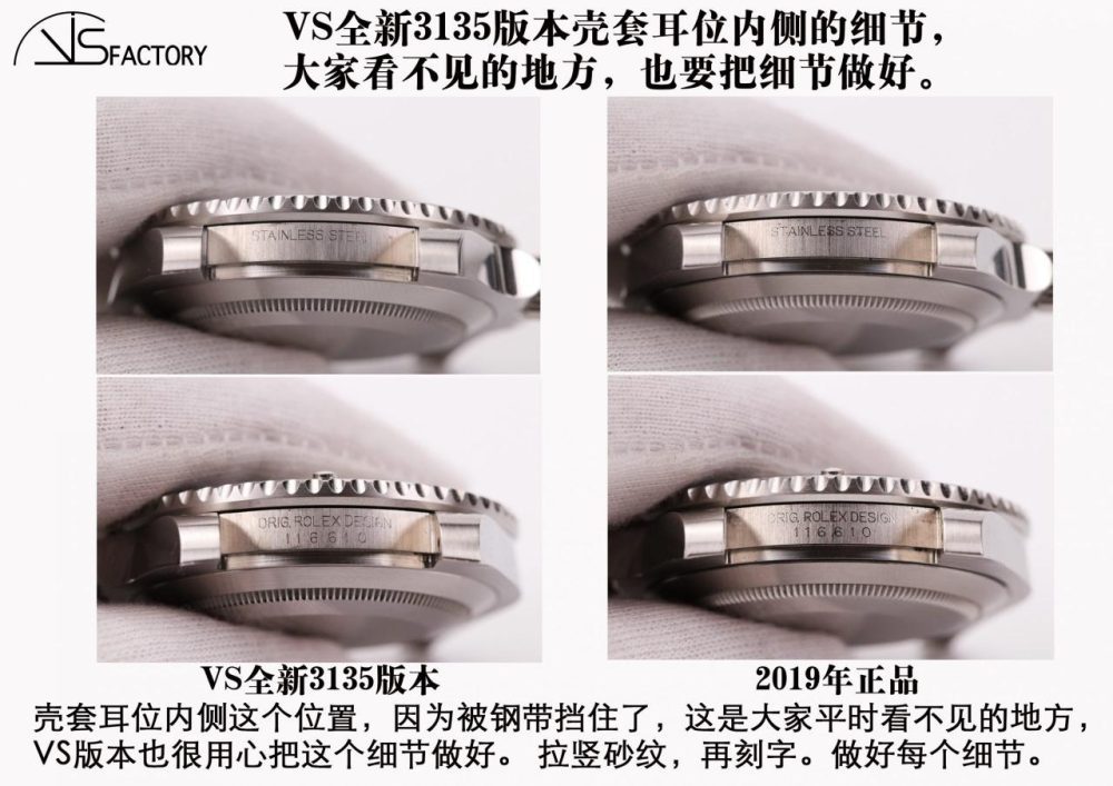 鋼帶帶面拉砂細節的好壞會影響整表的質感。 VS 版本的鋼帶,通過採用進口砂紙,增加拉砂的次數等方法,把拉砂紋處理得更接近正品質感,砂紋清晰、細膩、完整。 正品才是檢驗一切的標準。 不要憑印象,跟正品比才準。