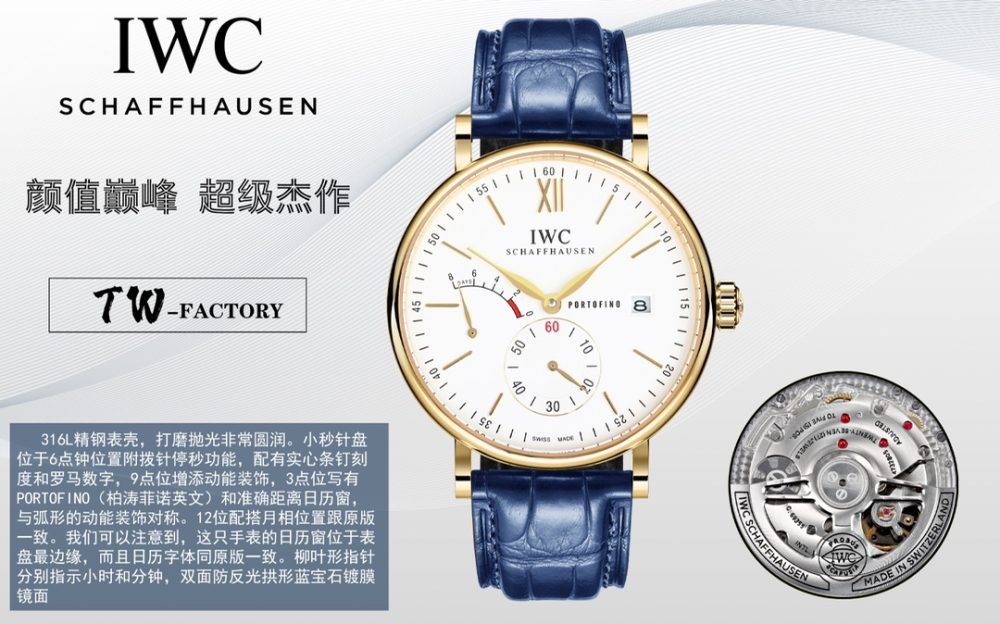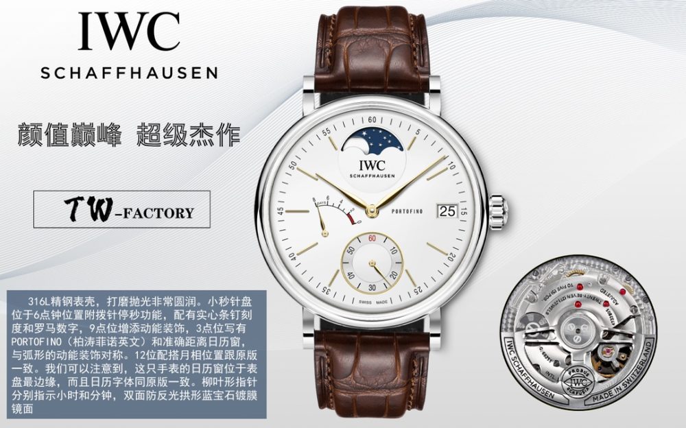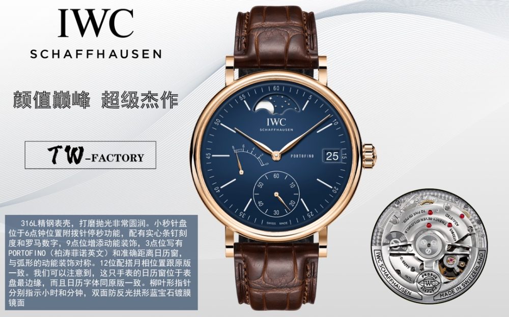 TW廠推出全新萬國柏濤菲諾系列IW510103腕錶新品,這款精緻的復刻手錶實現了顯著的手錶升級。腕錶採用316L精鋼錶殼與義大利小牛皮錶帶,搭載穩定自主機芯,具備長動能與月相功能。此高仿手錶完美還原原版設計,包括標誌性錶盤布局與細節,是高仿腕錶市場中的卓越之作,專為追求優雅風範的商務人士打造。