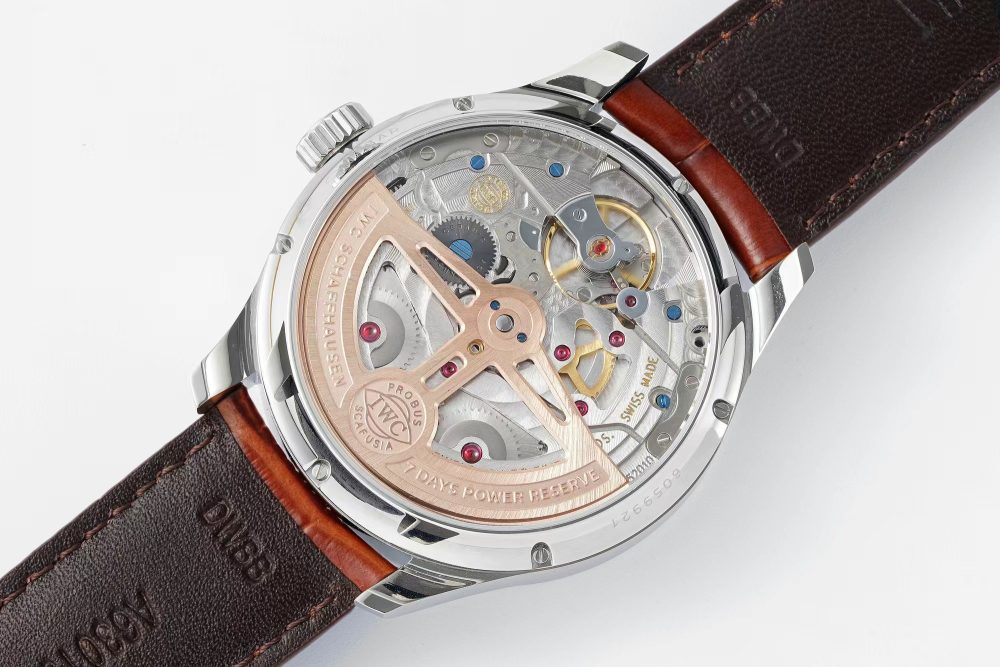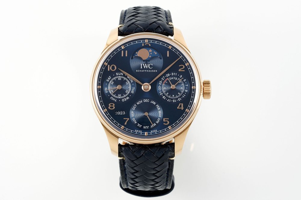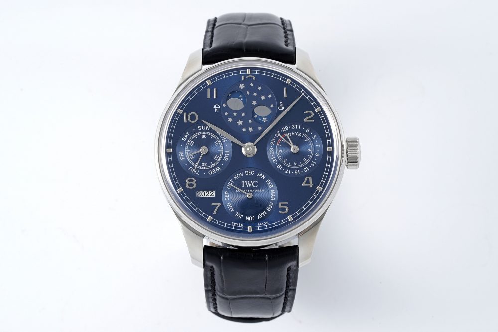 APS新品推出高仿萬國葡萄牙系列萬年曆腕表,這款高仿手錶完美復刻手錶原版功能。所有萬年曆顯示均同步原裝,可通過把頭調節日月星辰、星期、月份、年份及動力儲存。這款復刻手錶採用葡七基礎機芯,具備72小時動力,外殼與藍寶石鏡面做工精細,是高仿腕錶中的頂級之作。