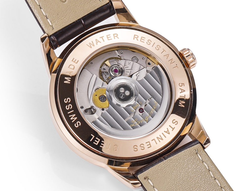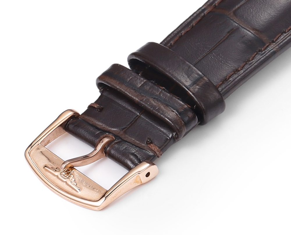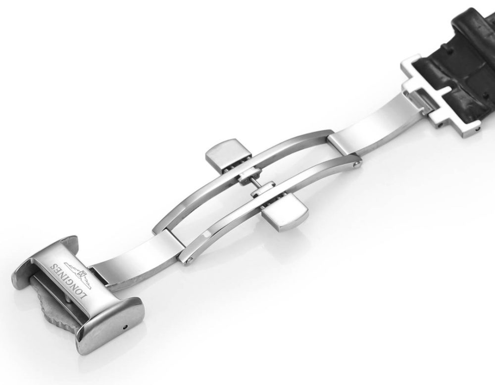 原裝針扣上有著浪琴專屬標誌,搭配義大利小牛皮讓手腕更貼合舒適,