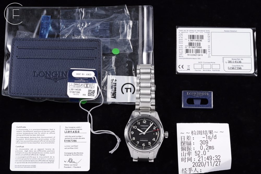 每一隻腕表出廠前都經 CF 製表師調試至最佳狀態並附帶機芯檢測報告單一份,隨表附送正品一致的頭層牛皮皮套與五碼合一。