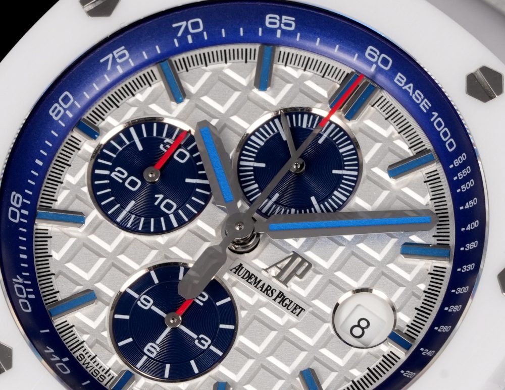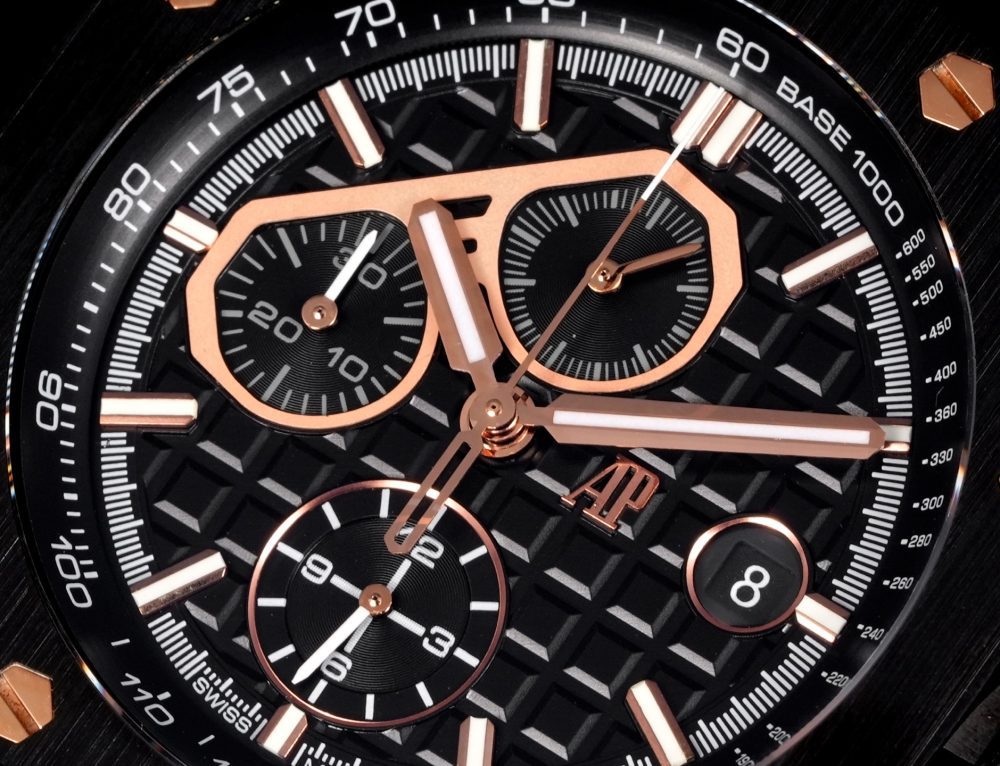 4.表盤以愛彼經典的大格紋為背景,層次分明的方格排列,經過完美打磨, 將匠人的工藝體現的淋漓盡致