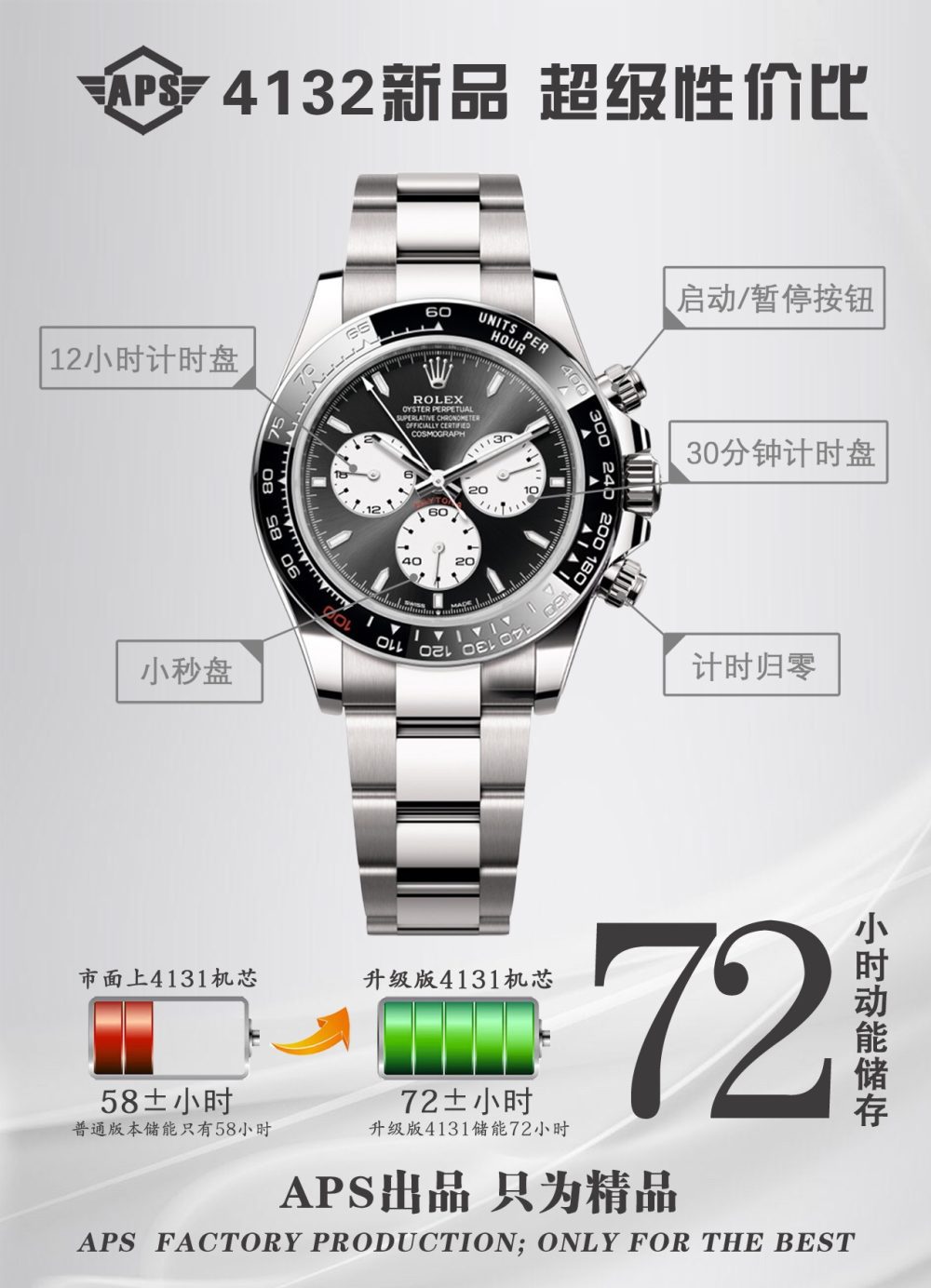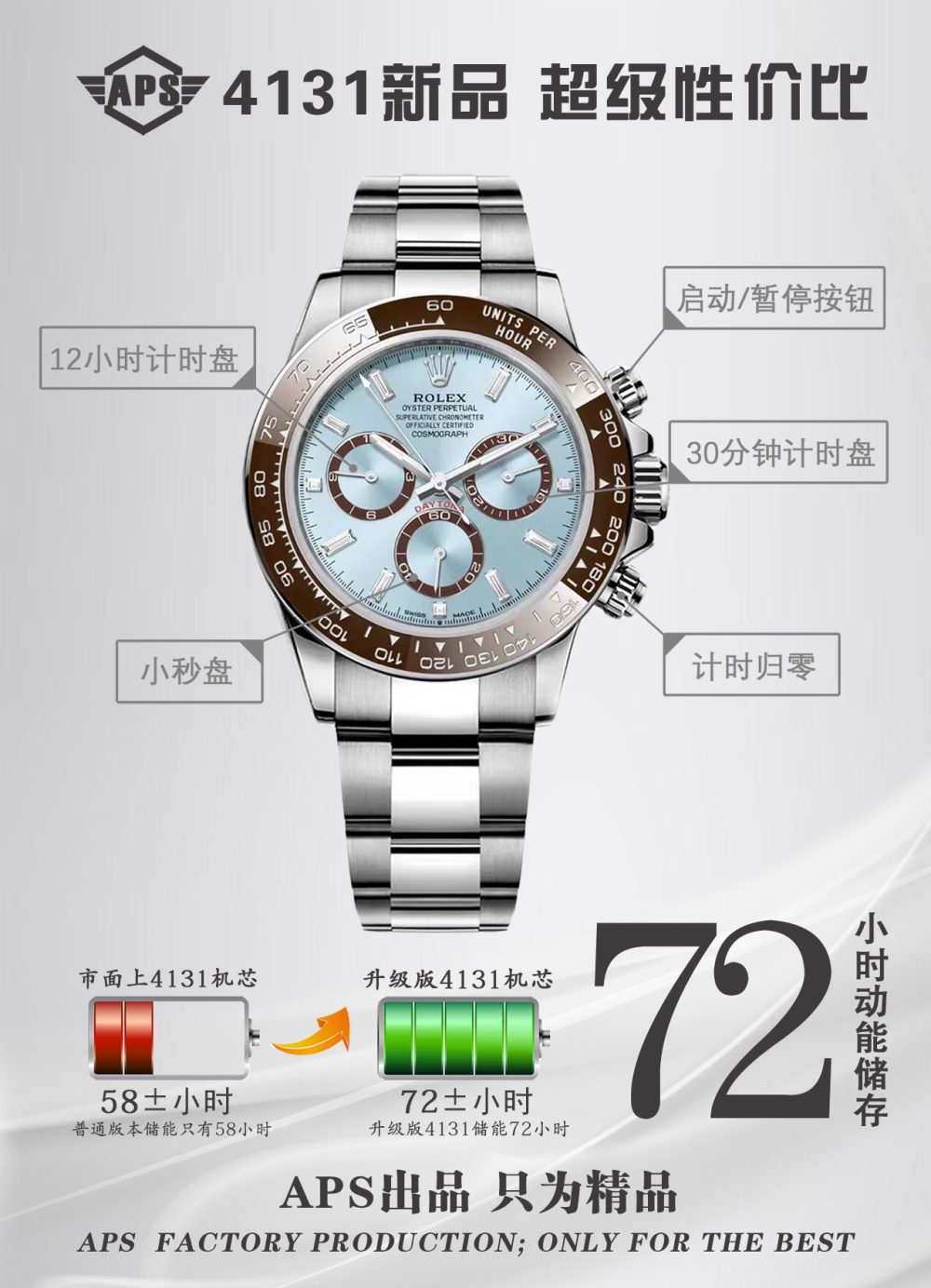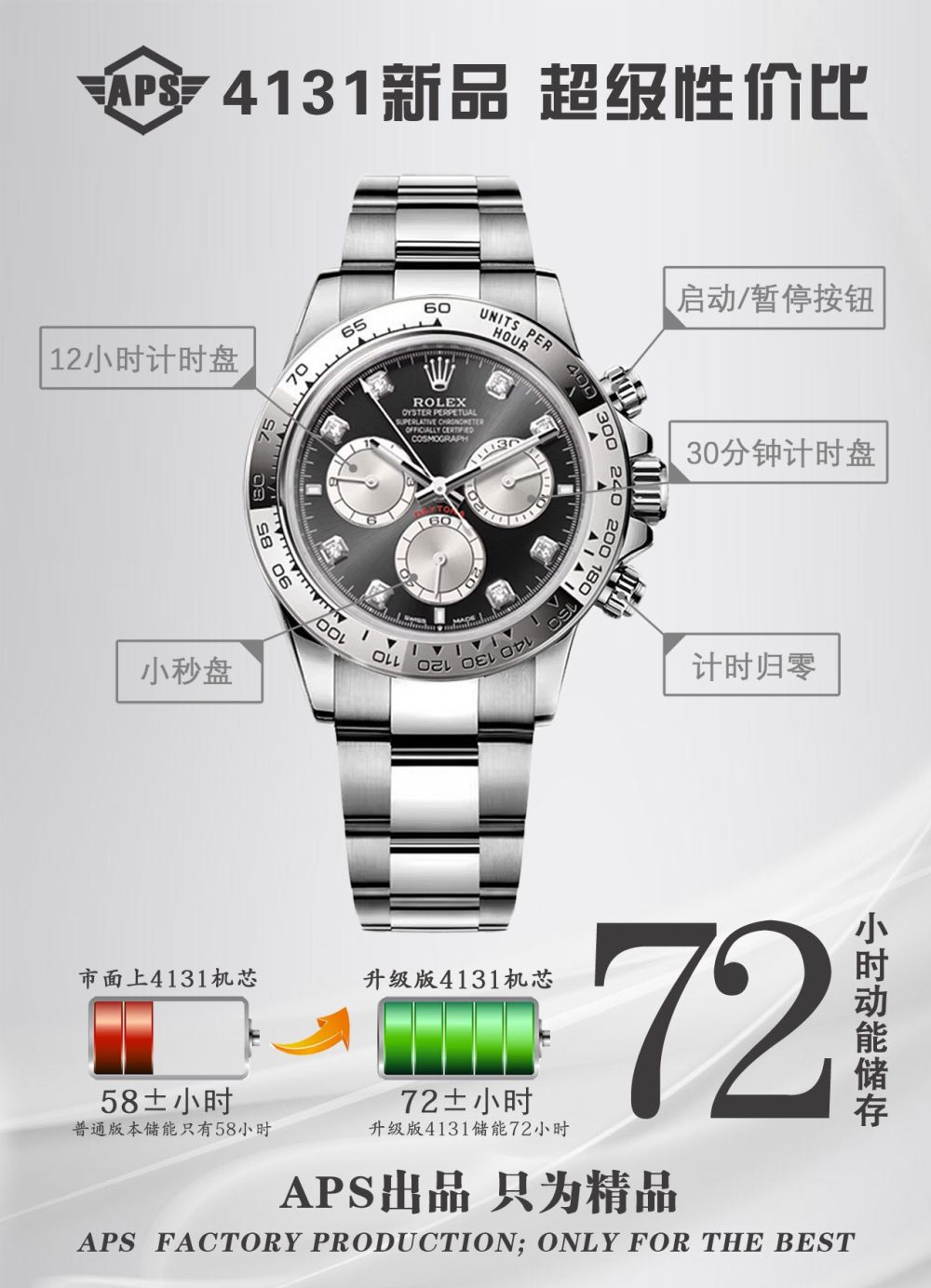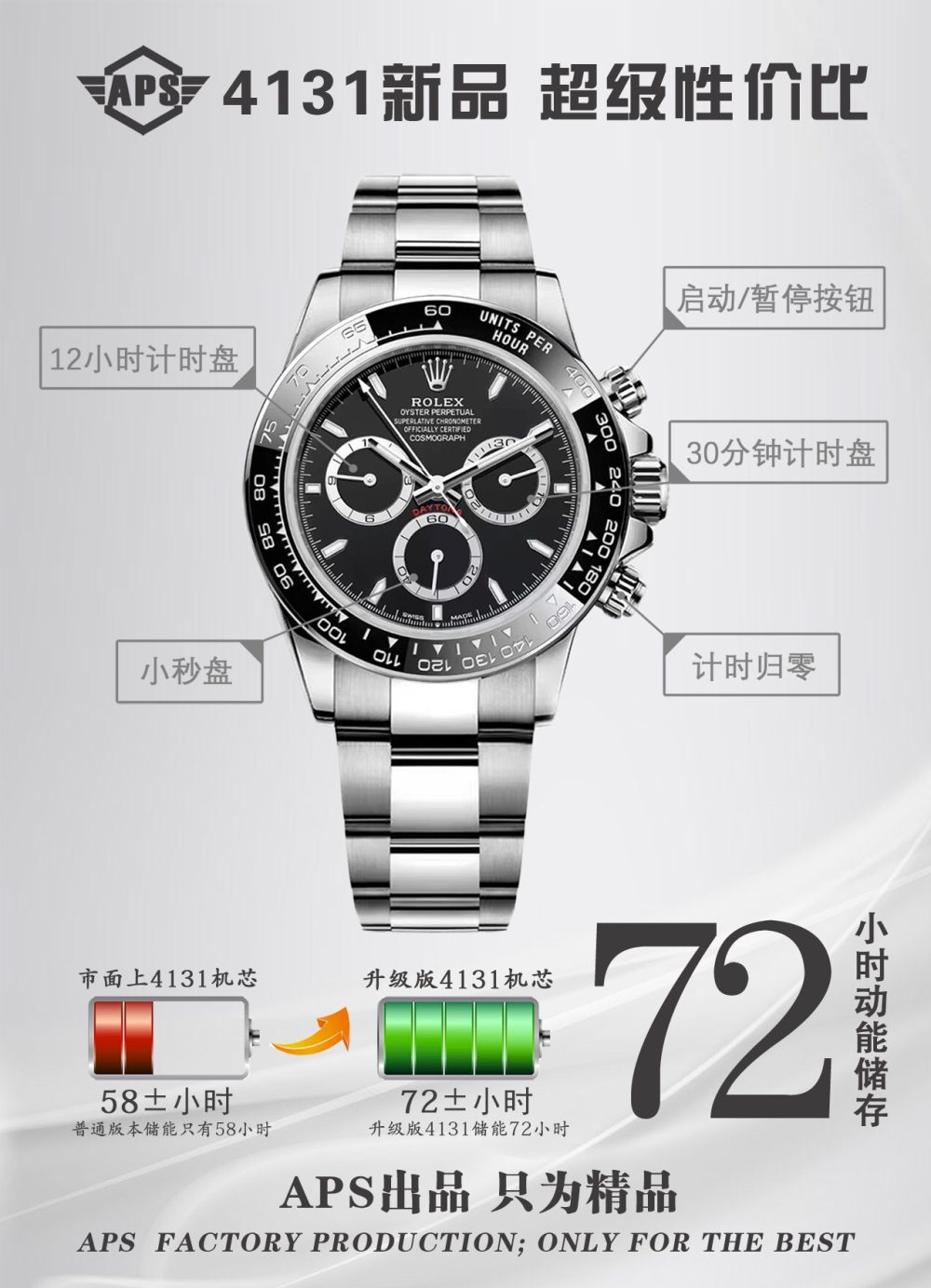 APS推出搭载勞力士4131機芯的復刻手錶新品,致敬迪通拿系列60周年。这款新品在细节上全面升级:刻度时标与计时表盘更纤细,六点位新增皇冠标志,陶瓷圈外增加金属圈,表耳曲线更优美。機芯从4130升级为4131,APS通过正品开模,确保表壳、表带及盘面完美复刻,成为目前市面最高版本的復刻手錶,性价比极高。