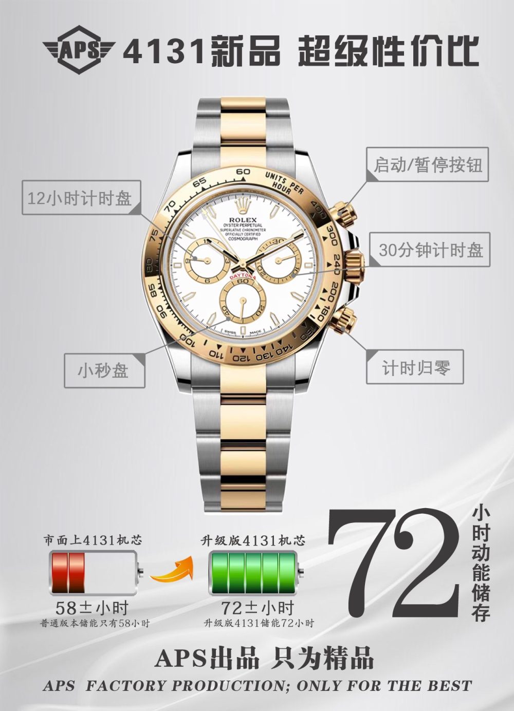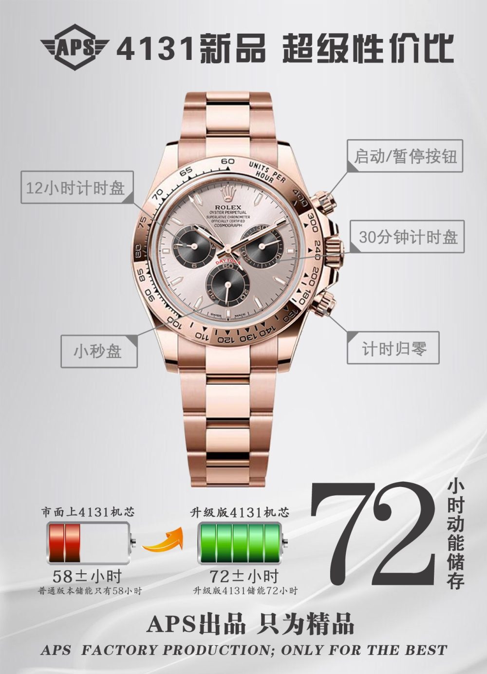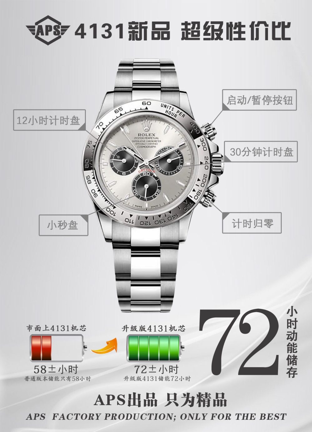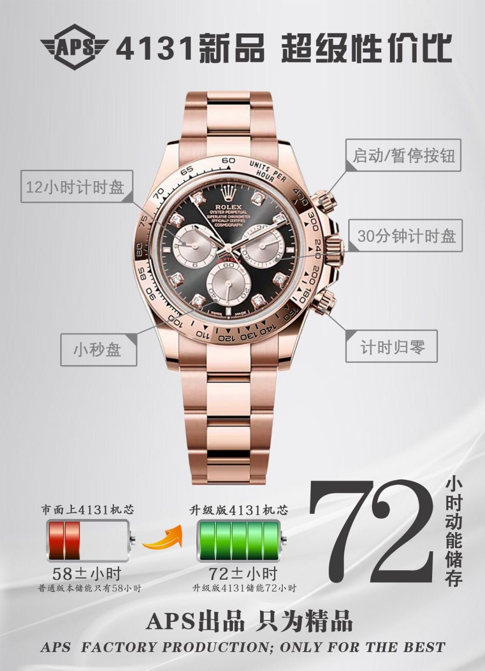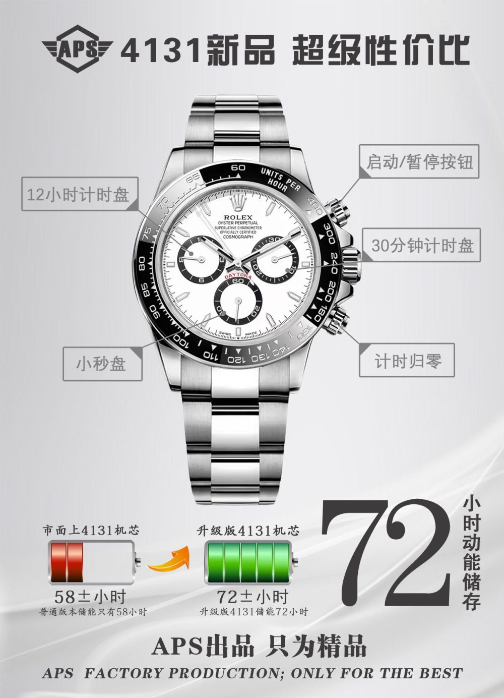 APS推出搭载勞力士4131機芯的復刻手錶新品,致敬迪通拿系列60周年。这款新品在细节上全面升级:刻度时标与计时表盘更纤细,六点位新增皇冠标志,陶瓷圈外增加金属圈,表耳曲线更优美。機芯从4130升级为4131,APS通过正品开模,确保表壳、表带及盘面完美复刻,成为目前市面最高版本的復刻手錶,性价比极高。