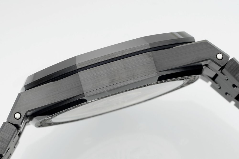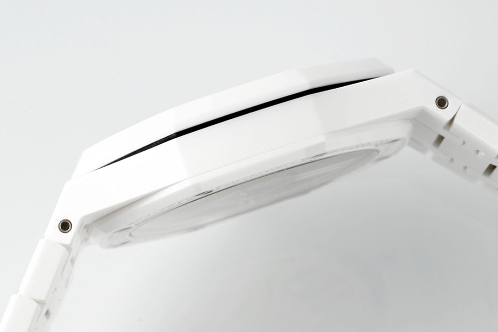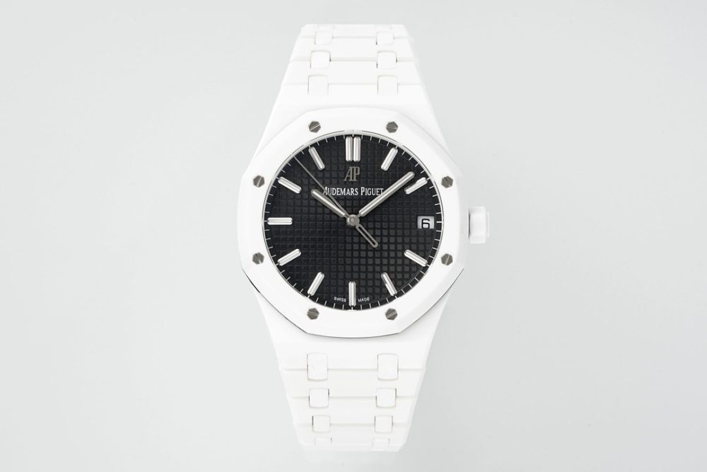 一體式結構:APS 錶殼與錶帶無縫銜接,延續皇家橡樹標誌性八角形錶圈和“Tapisserie”格紋錶盤,陶瓷材質賦予現代感。