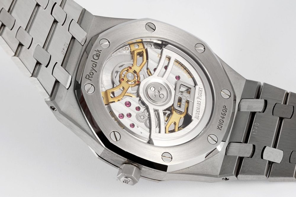 透明底蓋可顯示皇家橡樹最新 50 周年紀念機芯,升級配備了 Calibre 7121 機芯,較之前的 2121 機芯相比具有更高的節拍率和動力存儲。