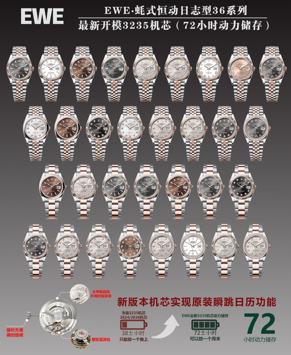 EWE廠手錶推出新款勞力士日誌型復刻手錶,專為男士腕表愛好者打造。此款腕表採用原版開模的3235機芯,確保36毫米直徑與11.7毫米厚度與正品一致。重點升級包括錶帶無縫連結、表扣彈簧設計及二維碼防偽,全套配置仿照原裝,為追求精準的復刻手錶收藏者提供高品質選擇。