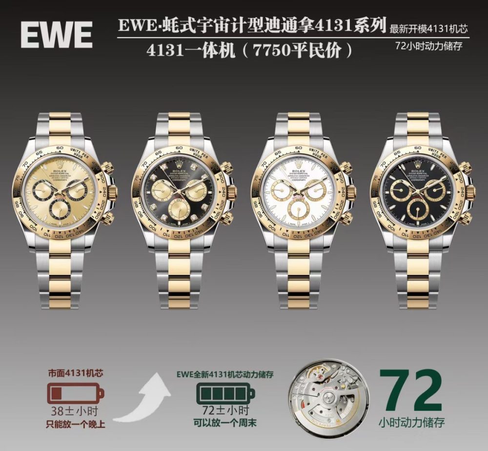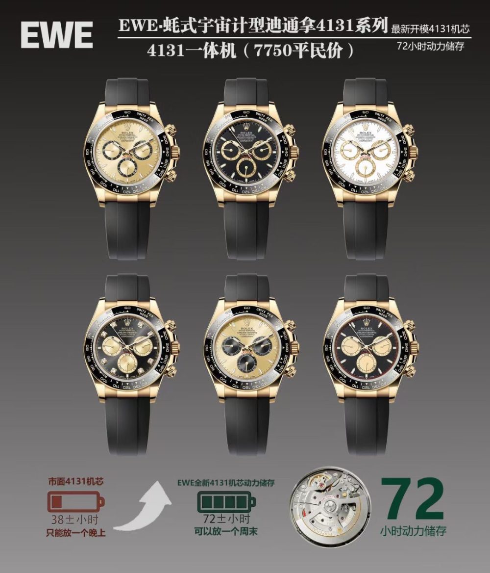 EWE廠推出勞力士迪通拿平民版復刻手錶,搭載全新的4131一體機芯,被譽為目前最穩定且對版的選擇,返修率極低。這款EWE廠新品在細節上全面升級,包括更纖薄的11.9mm殼套、纖細的刻度時標、優雅的計時表盤,以及六點位新增的皇冠標誌。它採用高品質錶盤與夜光指針,實現全功能計時與兩檔調時,同時陶瓷圈增加了金屬外圈。憑藉出色的做工與親民的價格,這款迪通拿平民版復刻手錶以超高性價比成為市場上的熱門之選。