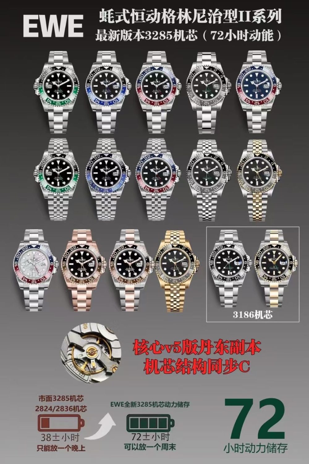 EWE推出的V5版勞力士格林尼治II GMT復刻手錶,搭載丹東獨家Cal.3285機芯,具備72小時動力儲存。此款復刻手錶採用進口904L鋼材打造,配備Clean V2真陶瓷雙色圈口,並通過高溫燒製與白金鐳射雕刻工藝。其GMT功能與原版一致,時針快跳調整日曆,指針層次分明,完美還原勞力士格林尼治的低調奢華質感與實用雙時區性能。