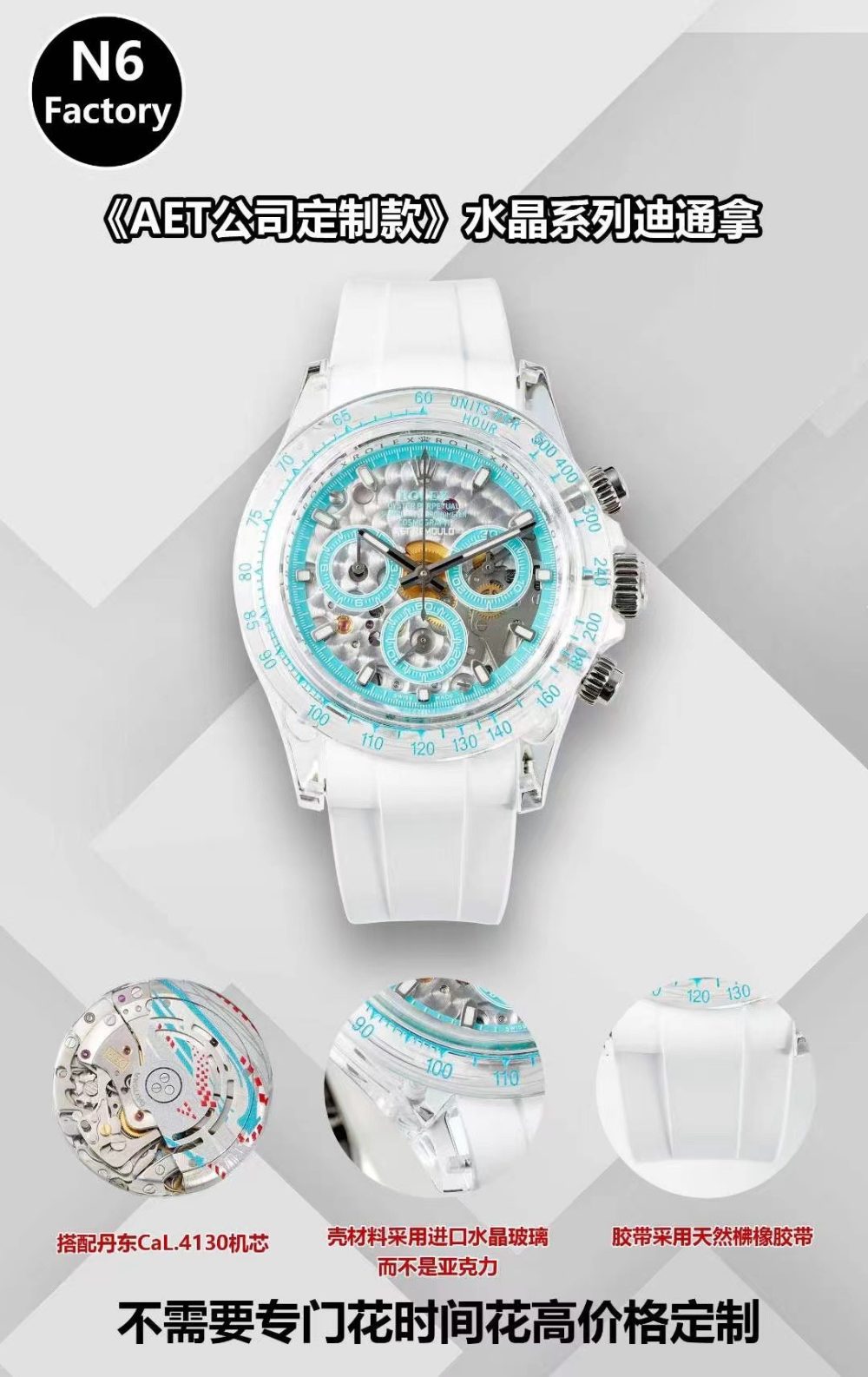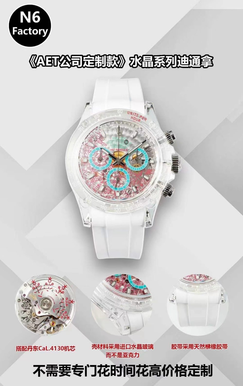 德國改裝品牌AET REMOULD推出全新N6新品復刻手錶,這款水晶玻璃迪通拿腕錶備受矚目。它搭載丹東正品4130機芯,確保所有功能與計時操作均與原版同步。最大亮點在於採用進口水晶玻璃材質,可清晰透視內部精密機芯運作。此外,錶款選用904L精鋼打造表扣與按鈕,並配備天然真隕石錶盤,透過色彩繽紛的設計與細緻打磨,為錶盤注入更多活力與質感。