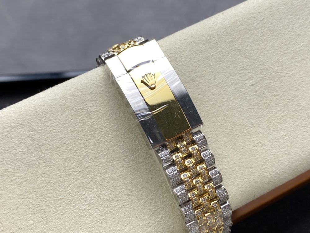 【錶帶】採用最新 904L 蠔式鋼打造,平整的鏈節組成,極其堅固,表鏈全身也整齊縝密的鑲滿美鑽,效果光華四射。