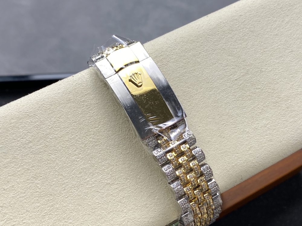 【錶帶】採用最新 904L 蠔式鋼打造,平整的鏈節組成,極其堅固,表鏈全身也整齊縝密的鑲滿美鑽,效果光華四射。