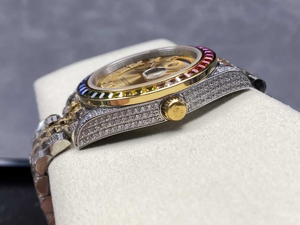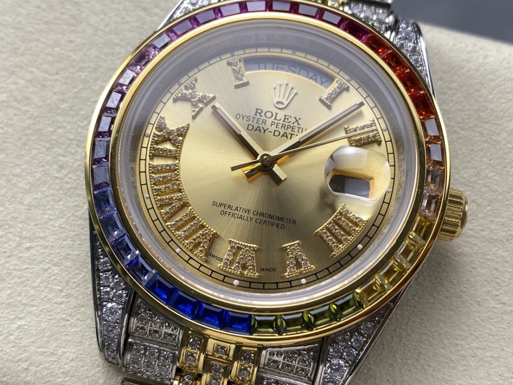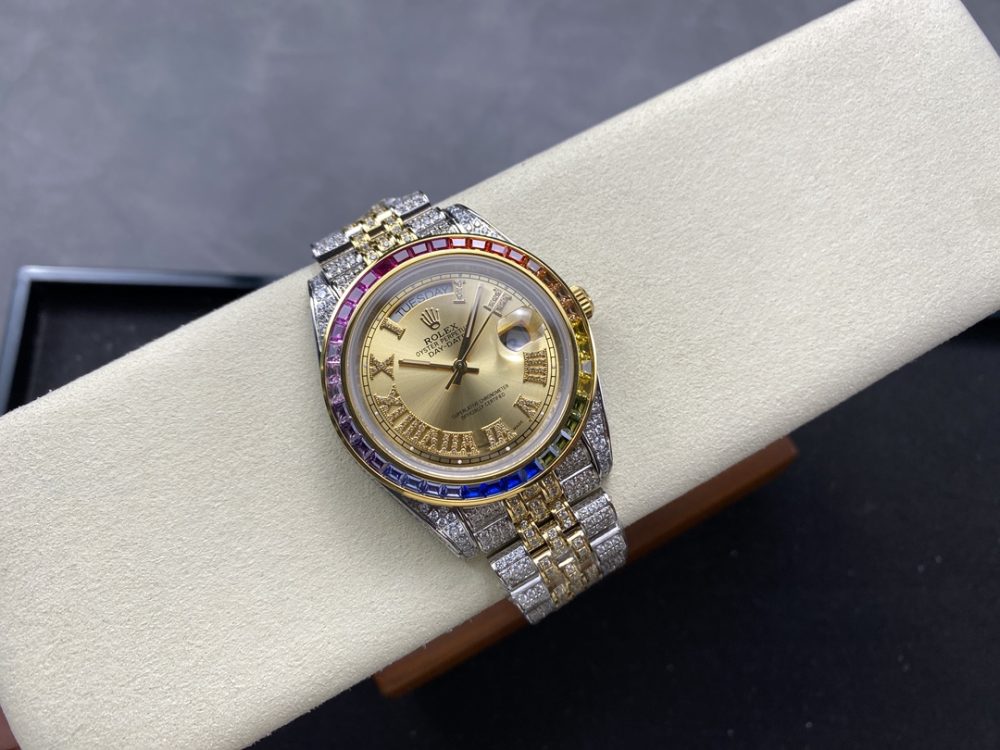 这款精仿手錶完美复刻了奢華的勞力士星期日誌型腕表。它是一款定製滿鑽的個性特別款,表殼、表圈及鏈帶均密鑲頂級施華洛世奇鑽石,光華四射。採用堅固的904L蠔式鋼與穩定自動機芯,在還原正品無敵質感的同時,以更親民的價格讓佩戴者尊貴非凡,盡顯獨特氣質。這款精仿手錶是追求極致奢華與個性風範的絕佳選擇。
