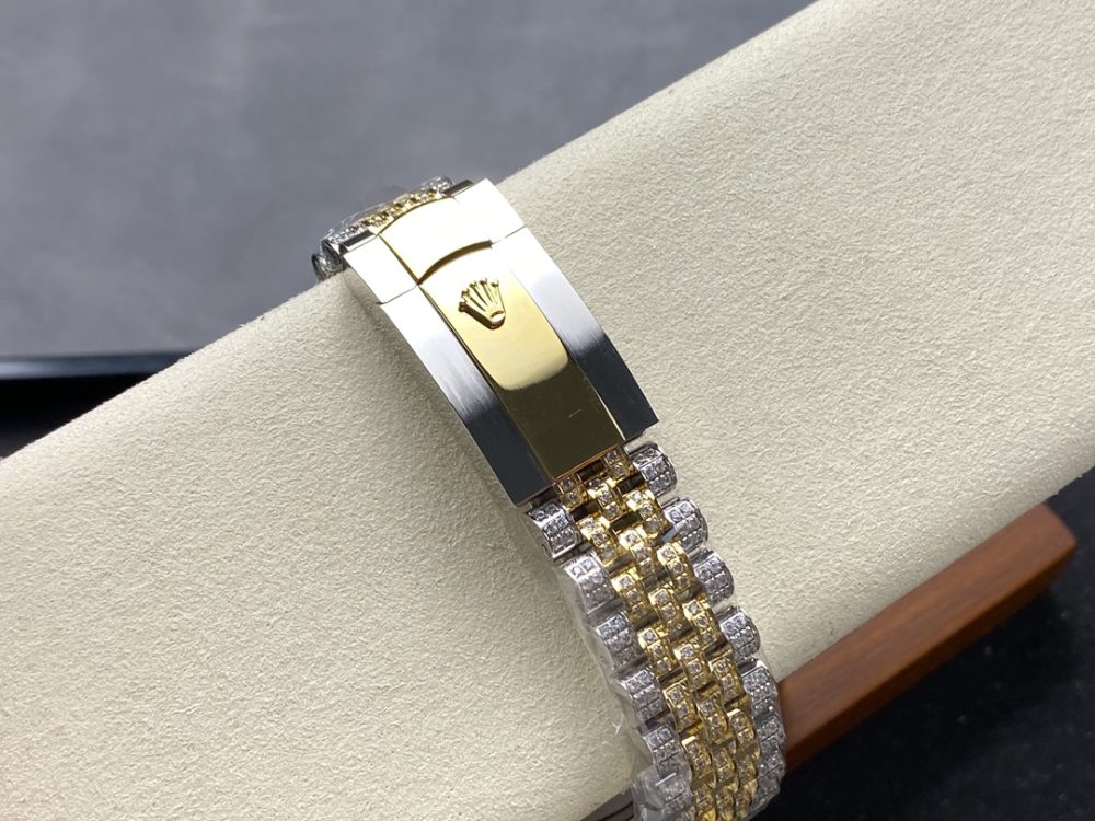 【錶帶】採用最新 904L 蠔式鋼打造,平整的鏈節組成,極其堅固,表鏈全身也整齊縝密的鑲滿美鑽,效果光華四射。