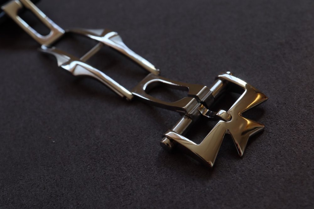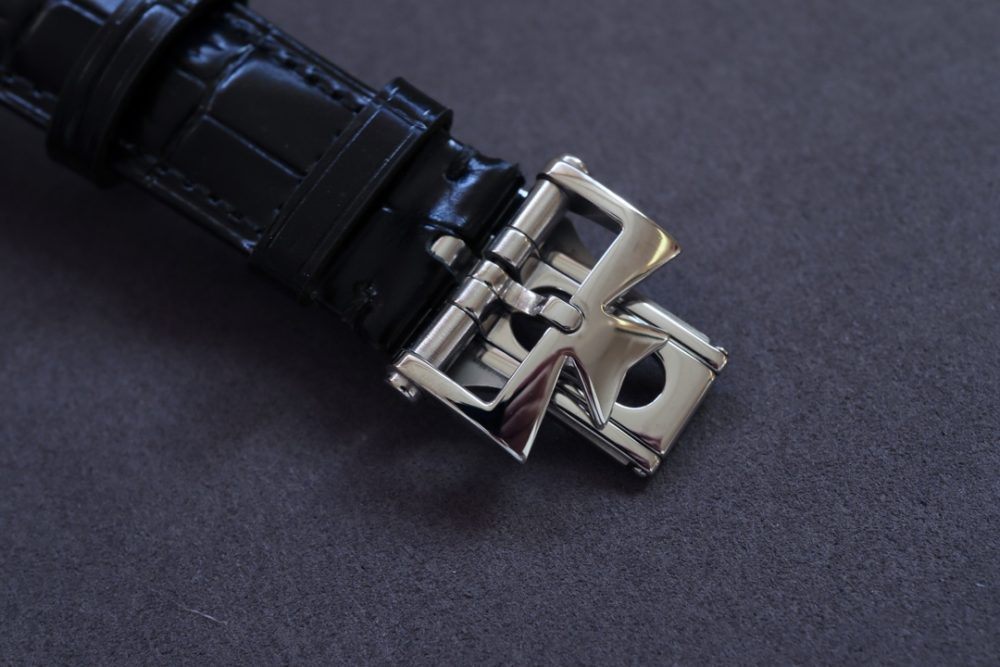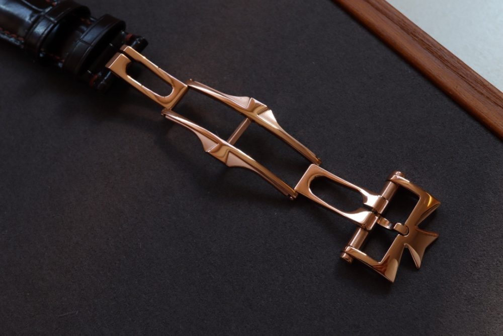 星期和月份視窗對稱分佈於錶盤兩側,表盤週邊的數宇表圈為日曆顯示. 由一根優雅的黑色月牙指標輕輕托起,方便讀取。