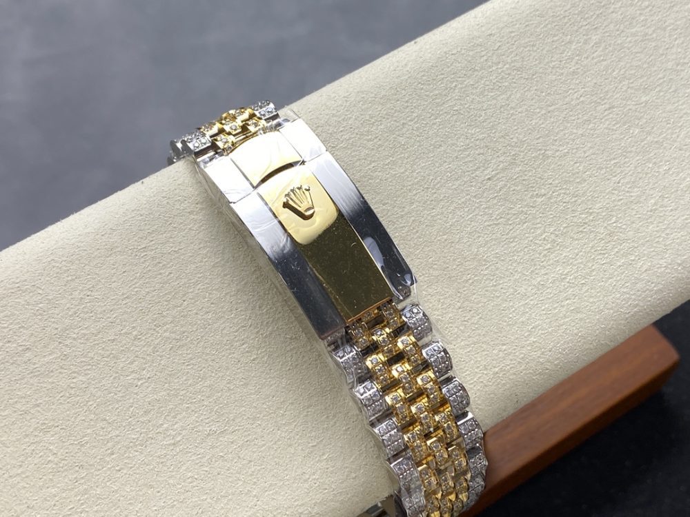 【錶帶】採用最新 904L 蠔式鋼打造,平整的鏈節組成,極其堅固,表鏈全身也整齊縝密的鑲滿美鑽,效果光華四射。