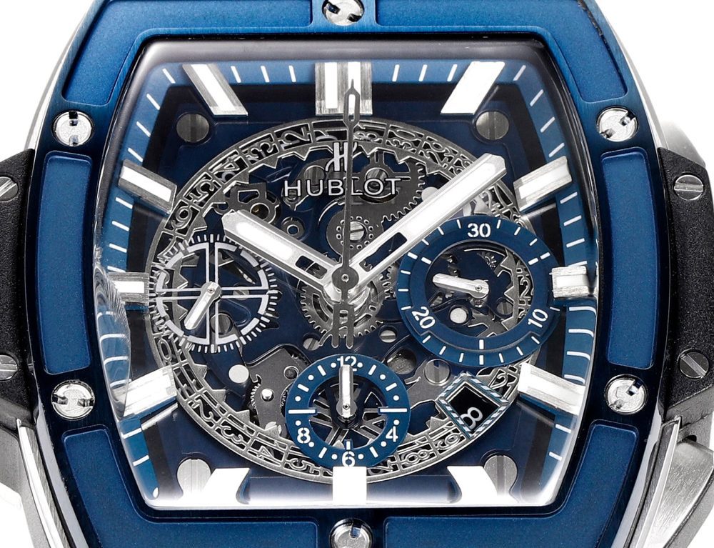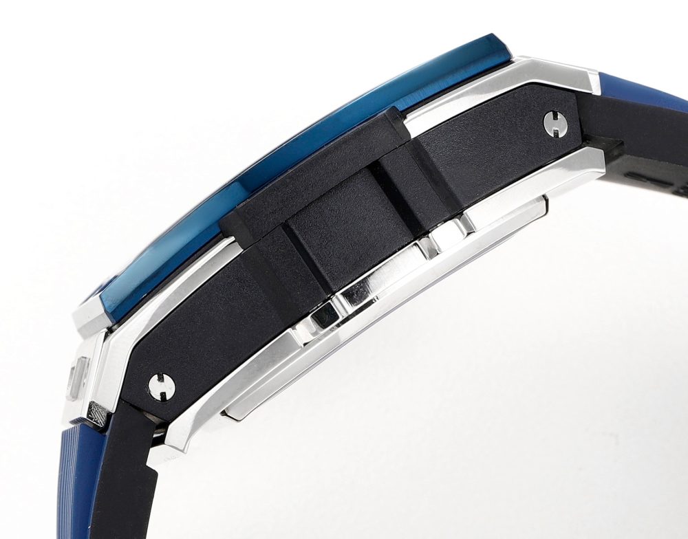 錶殼應用鈦金屬跟樹脂材料,借助六枚 H 型螺絲構建“三明治”結構,傳達“融合的技術”的理念,