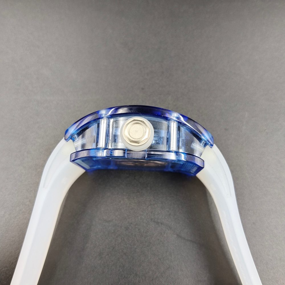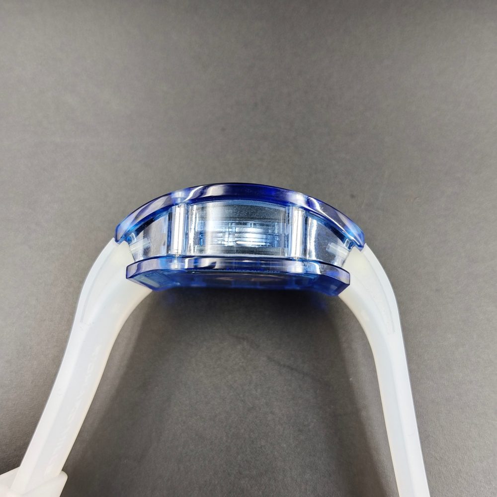 腕表採用品牌標誌性表殼設計,運用透明有機玻璃材質雕刻製作!