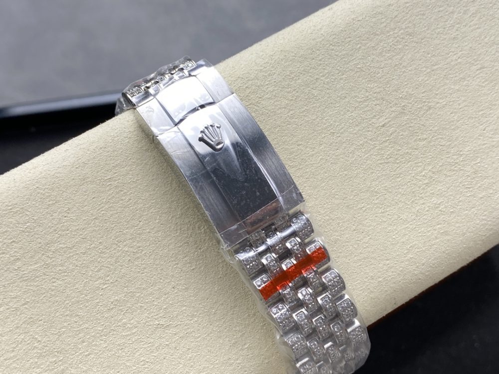 【錶帶】採用最新 904L 蠔式鋼打造,平整的鏈節組成,極其堅固,表鏈全身也整齊縝密的鑲滿美鑽,效果光華四射。
