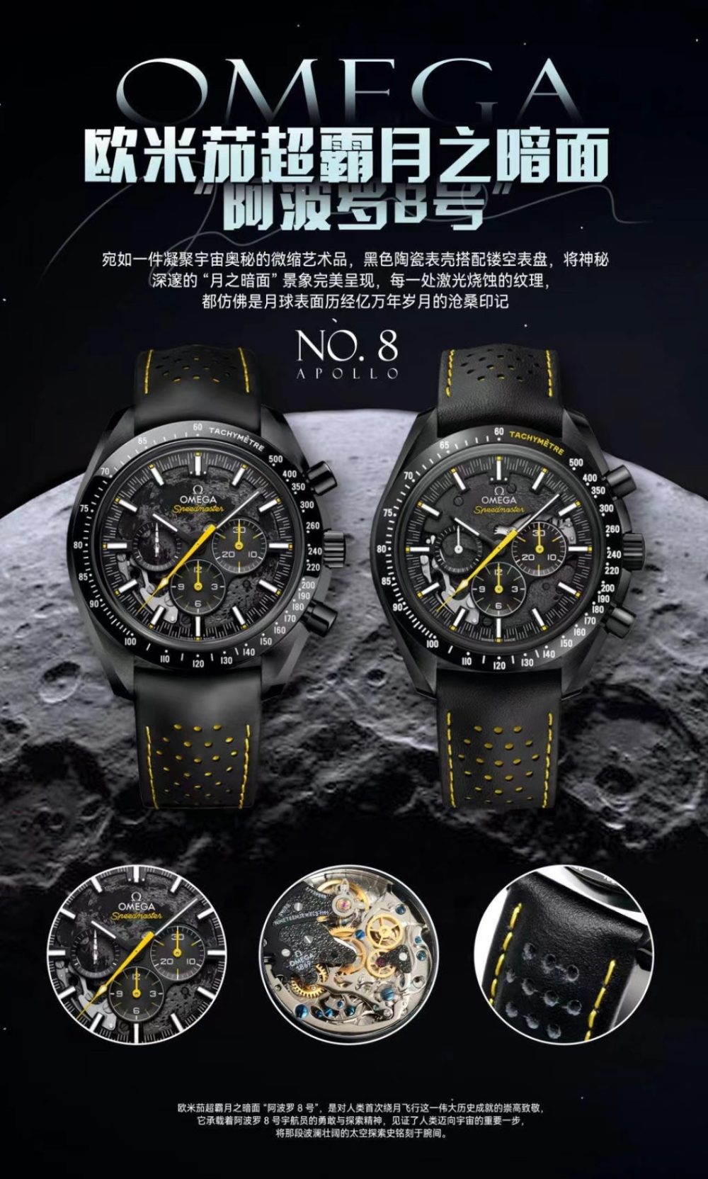 歐米茄超霸月之暗面「阿波羅 8 號」的盤面、進行了模仿月球表面的雕刻,