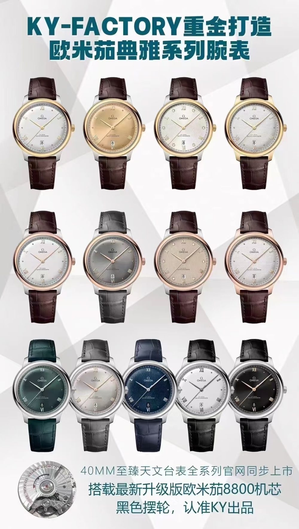 KY廠最新推出的這款復刻手錶,精準再現了歐米茄碟飛系列40毫米至臻天文臺表的經典設計。這款高仿腕錶採用精鋼錶殼與深藍色紋理錶盤,搭配羅馬數字時標及透底表背,內部搭載仿製的8800同軸機芯,展現了高仿手錶在細節上的卓越工藝。對於鐘愛機械手錶的鑒賞家而言,此復刻手錶提供了兼具美學與精密仿製技術的優質選擇。
